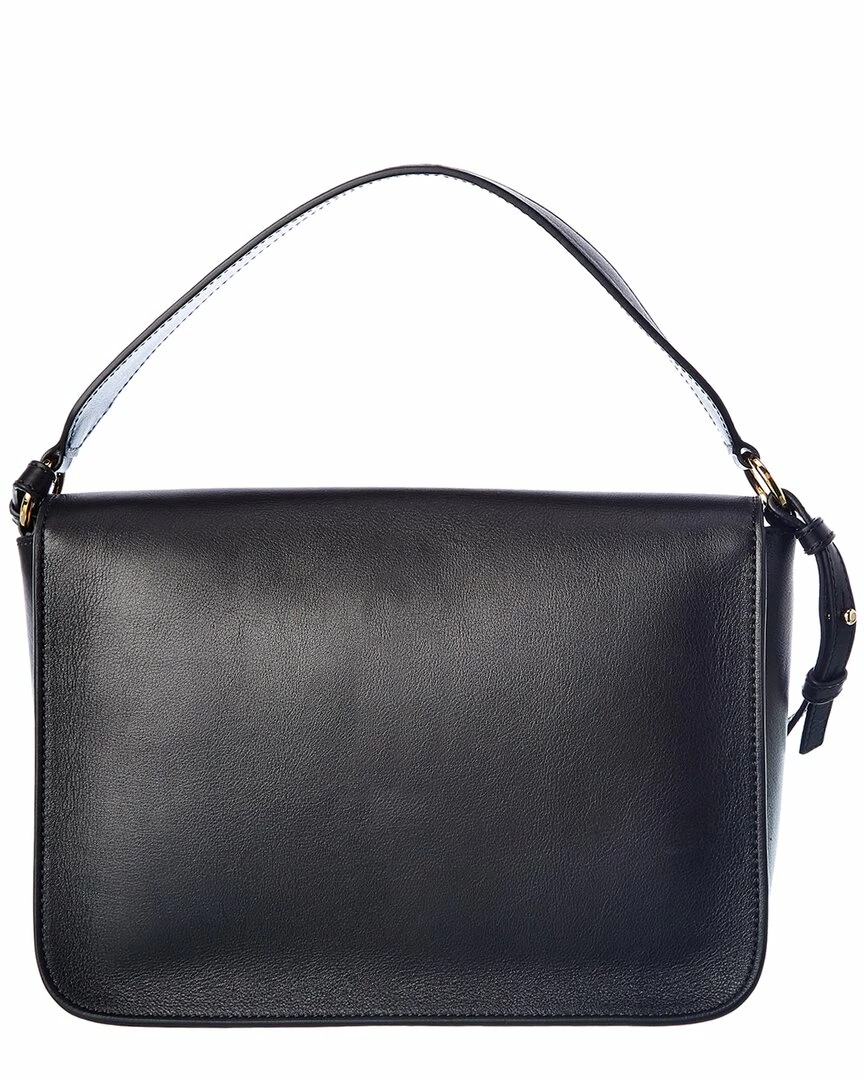 - Design details: gold-tone hardware, tortoiseshell logo accent and exterior pocket