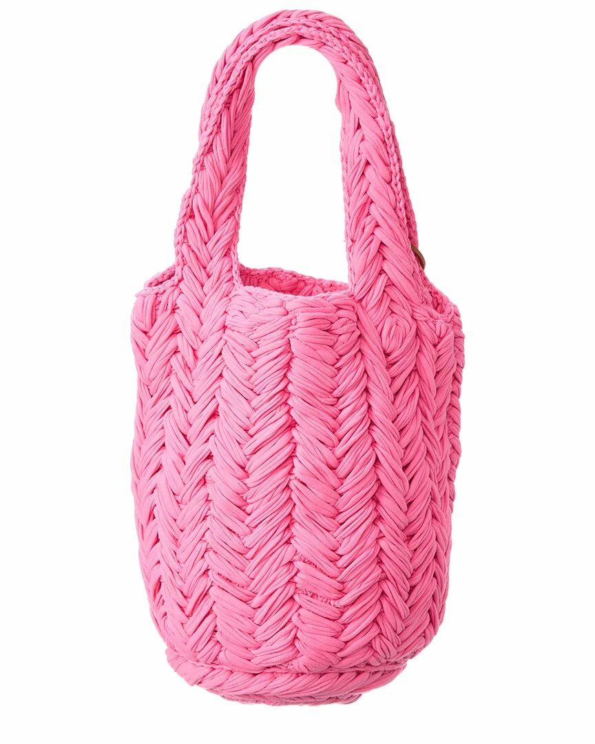- Color/material: pink woven textile